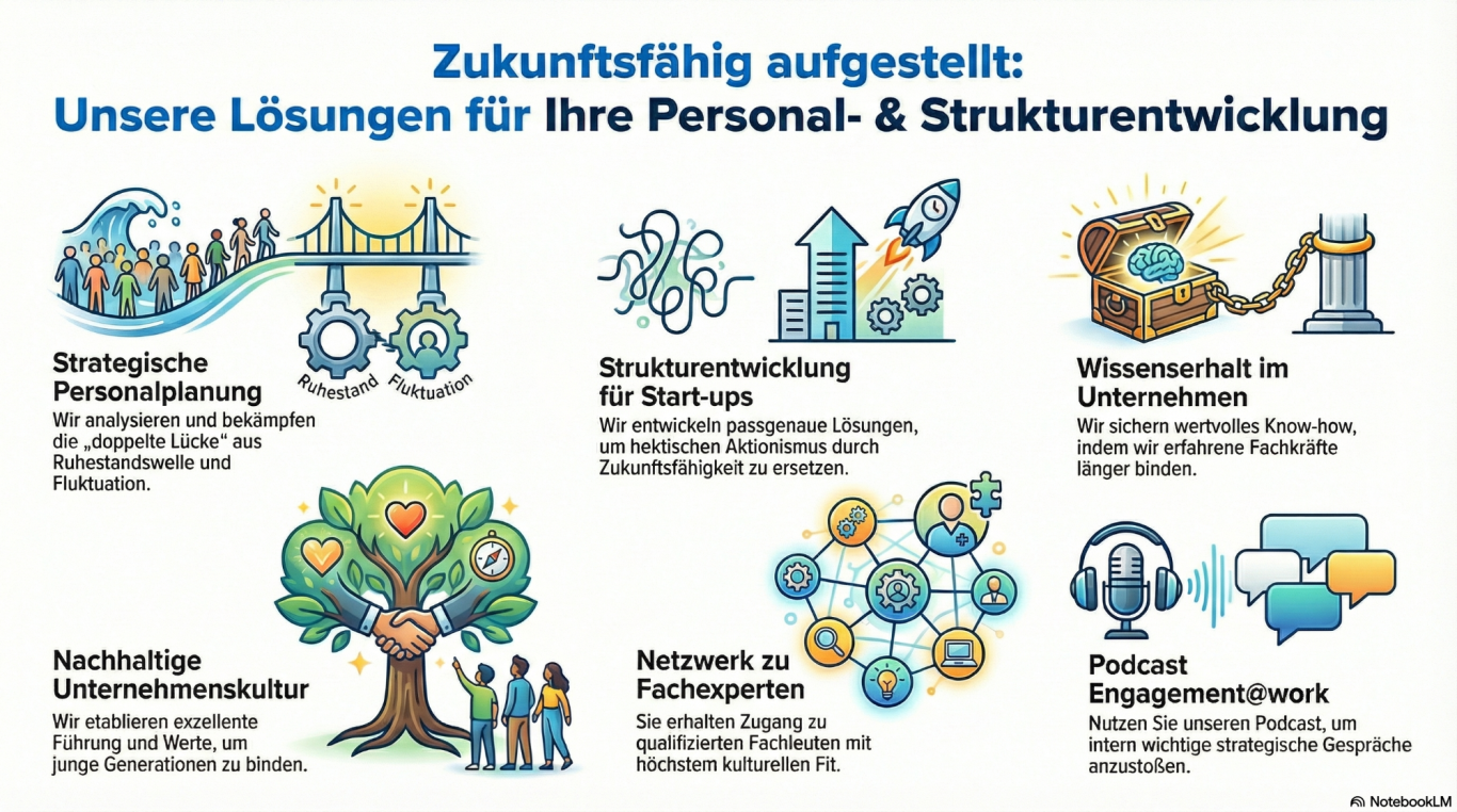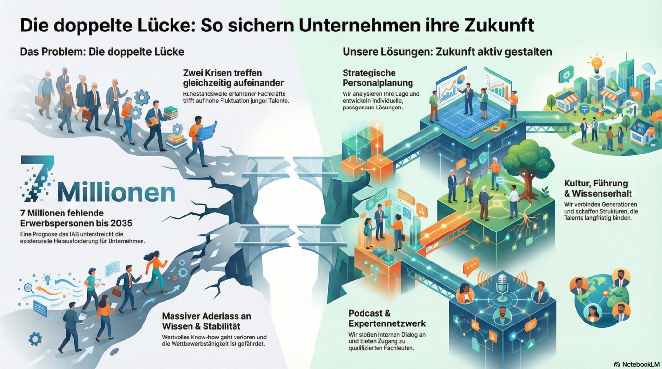 Für Sie als Interessent bedeutet unsere Strategie, dass wir uns auf die wirklichen Schlüsselthemen der Arbeitswelt fokussieren, wie die "doppelte Lücke" – der gleichzeitige Verlust erfahrener Fachkräfte und die hohe Fluktuation junger Talente.